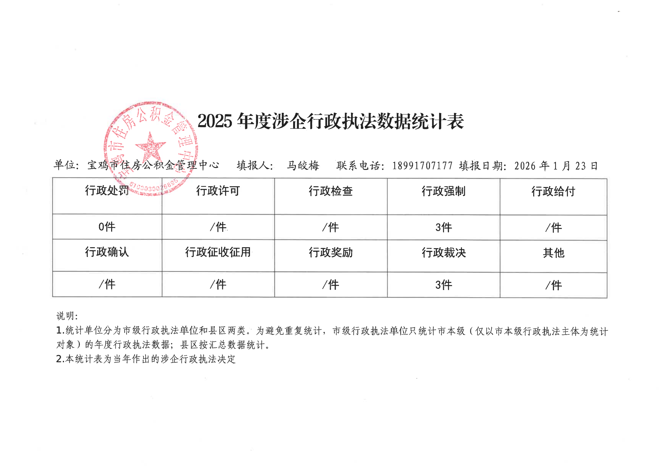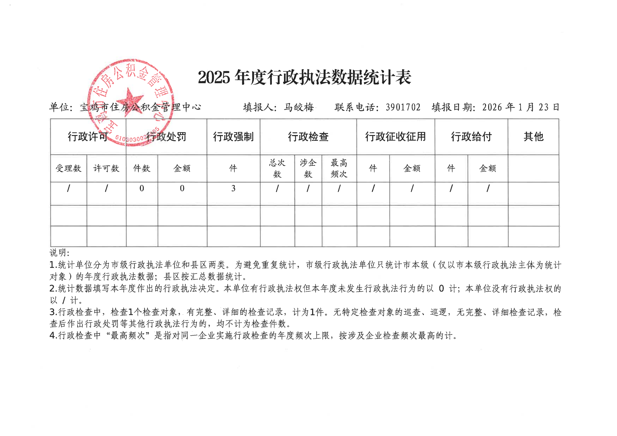 宝鸡市住房公积金管理中心2025年度行政执法统计年报